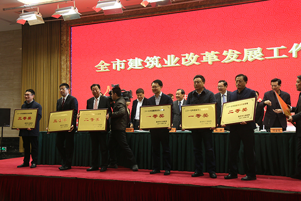會(huì)議觀看了2017年度揚(yáng)州建筑業(yè)發(fā)展專題片,何金發(fā)副市長宣讀了關(guān)于表彰2017年度全市建筑業(yè)先進(jìn)單位和先進(jìn)個(gè)人的決定。建工控股公司與江都區(qū)政府同獲市建筑業(yè)目標(biāo)管理一等獎(jiǎng),系統(tǒng)企業(yè)華建、揚(yáng)建及3家專業(yè)企業(yè)被表彰為“2017年度揚(yáng)州市建筑業(yè)先進(jìn)企業(yè)”。省政府五年一次表彰的江蘇省建筑業(yè)優(yōu)秀企業(yè)中,揚(yáng)州入選4家企業(yè),其中有3家是建工控股系統(tǒng)企業(yè)。王宏董事長被授予“2017年度揚(yáng)州市建筑功勛”獎(jiǎng)?wù)?,系統(tǒng)還有7名優(yōu)秀建造師、6名優(yōu)秀班組長被表彰為“2017年度揚(yáng)州市建筑業(yè)先進(jìn)個(gè)人”。謝正義、陳揚(yáng)等市領(lǐng)導(dǎo)為獲獎(jiǎng)單位和個(gè)人頒獎(jiǎng),王宏和宗有農(nóng)代表建工控股和江蘇華建上臺(tái)領(lǐng)獎(jiǎng)。